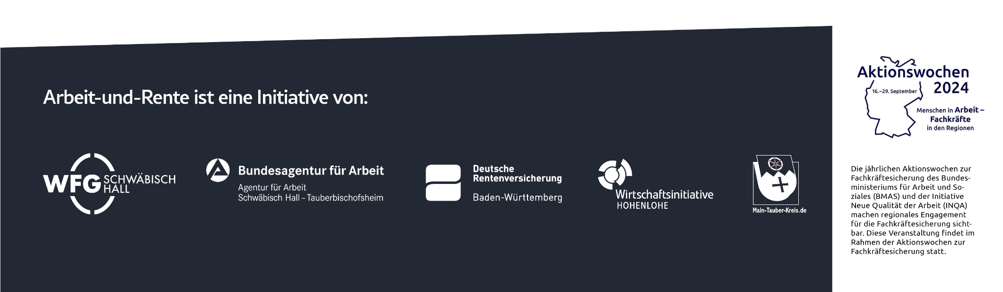 Ausgerichtet wird die Infoveranstaltung von der Wirtschaftsförderungsgesellschaft des Landkreises Schwäbisch Hall, der Agentur für Arbeit Schwäbisch Hall-Tauberbischofsheim, der deutschen Rentenversicherung Schwäbisch Hall, der Wirtschaftsinitiative Hohenlohe und dem Main-Tauber-Kreis.